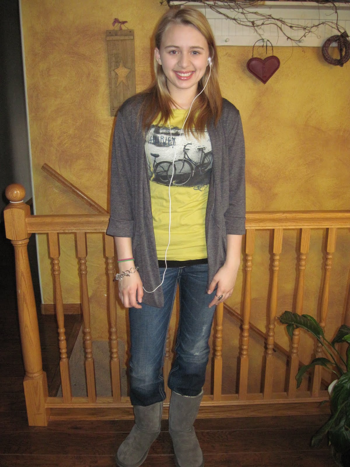 LOl Sidz really wanted to be in this pic she would not go away so i sat her down.Thursday: shirt: (fox) from pac-sun jeans: buckle sweatshirt: target scarf: wal-mart necklace:aeropostale this is the first thing ever that i have bought for myself here they had a really good deal! boots:American eagle